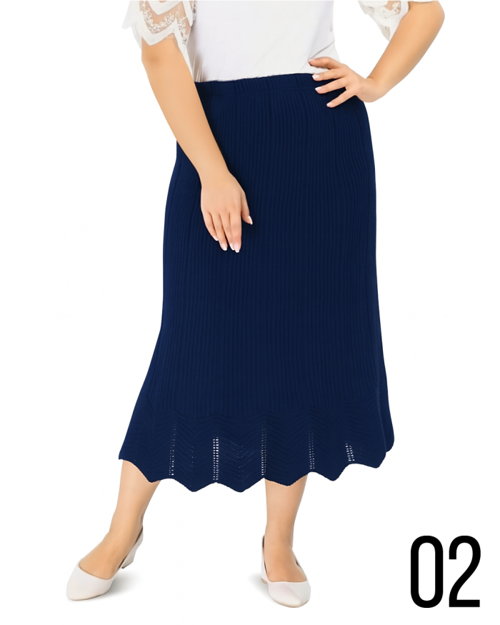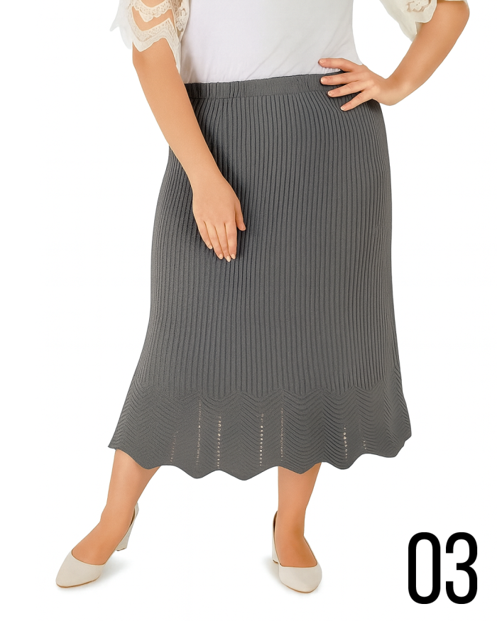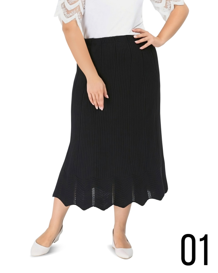 Fustă tricotată de culoare neagră, de lungime 70 cm sau 90 cm, cu un design simplu și elegant. Are o textură în dungi verticale, care creează un efect de alungire a siluetei. Fusta prezintă un model subtil ondulat în partea de jos, cu mici detalii de perforație în formă de zigzag, adăugând un accent estetic delicat.