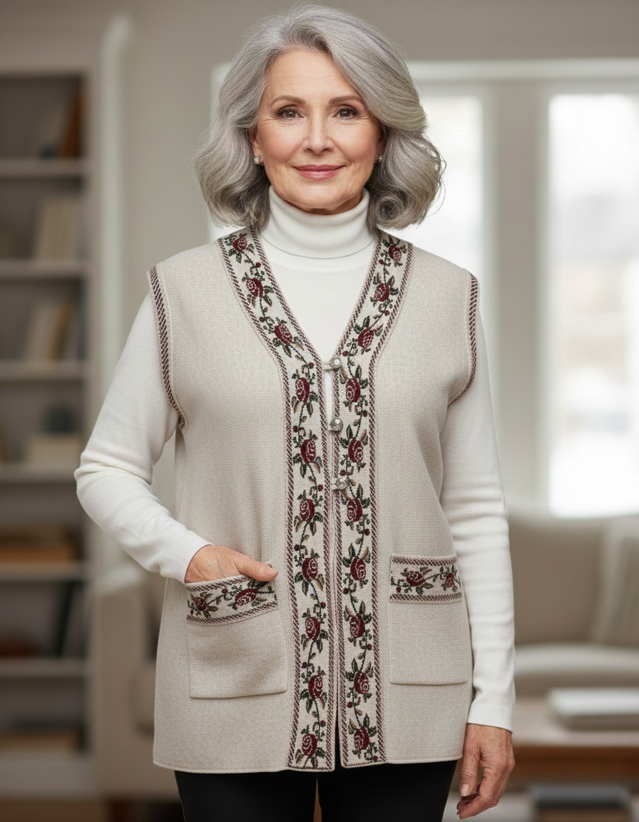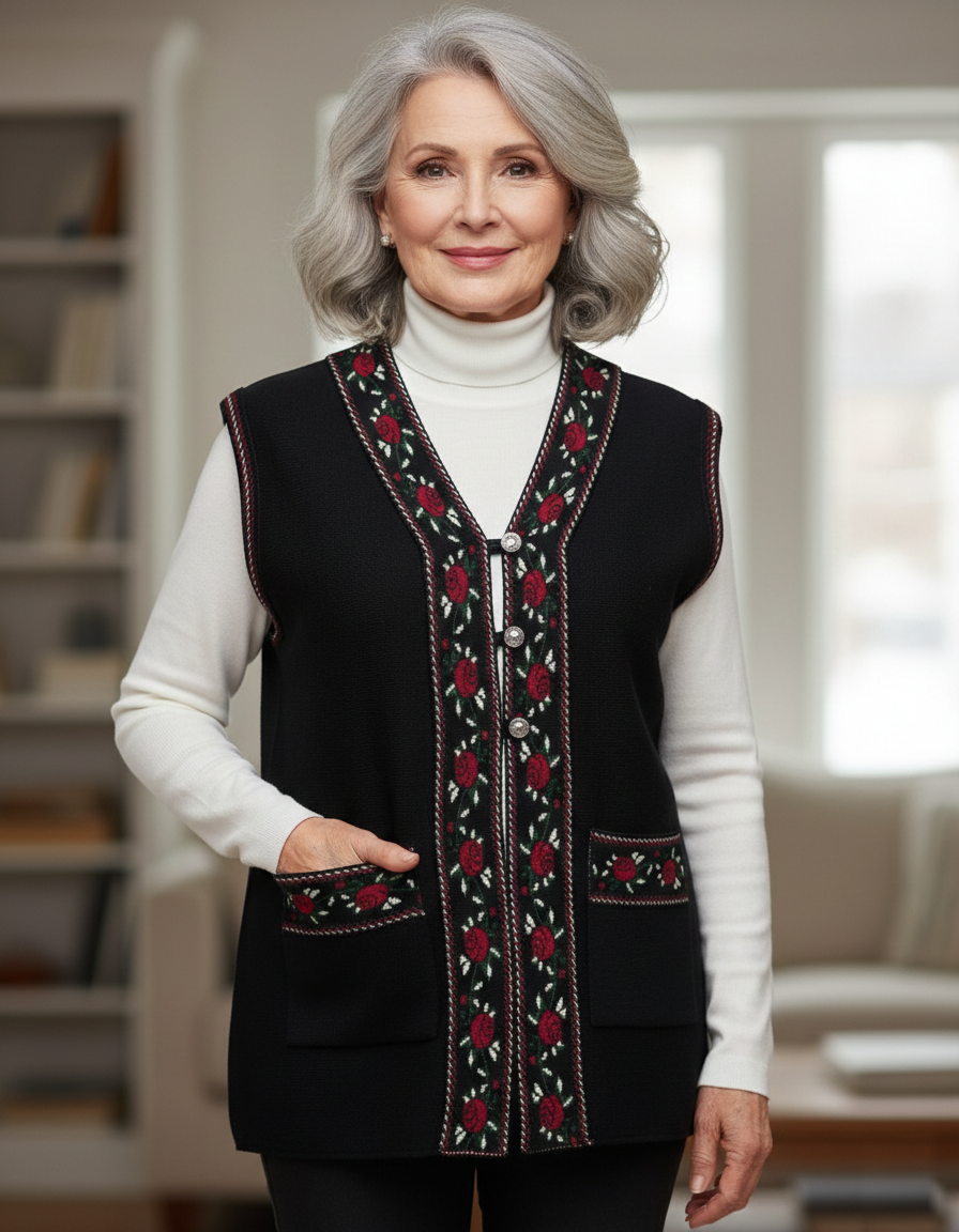 Îmbracă momentele răcoroase ale vieții tale cu o vestade damă, tricotată cu un imprimeu traditional floral, prevăzută cu buzunare și nasturi. Perfectă de purtat în sezonul rece şi uşor de combinat la multe ţinute, confortabilă, cu o lungime de cca. 70 cm.